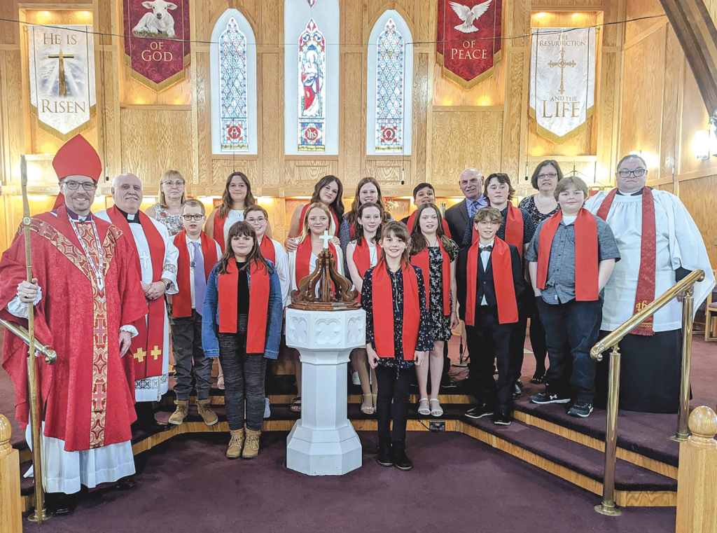 Fifteen confirmation candidates gathered for a luncheon and rehearsal on May 6, 2023. They were fortunate that the Bishop could join them and spend time